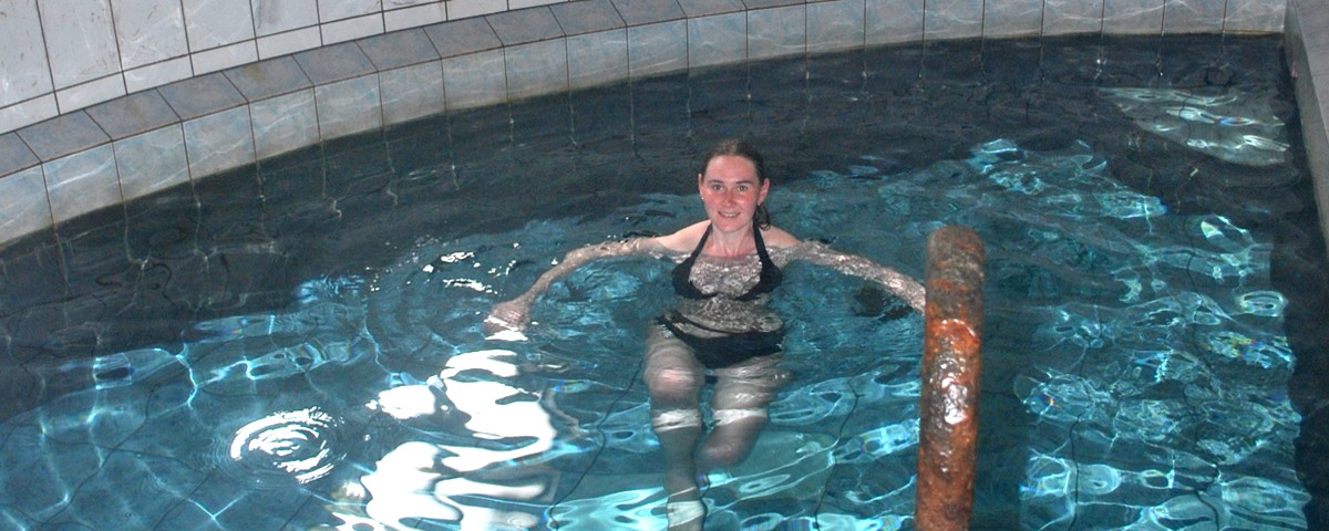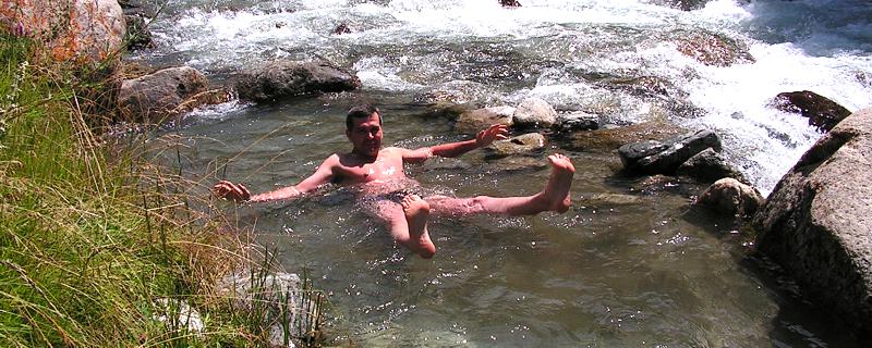 Через 6 км. пути подъезжаем к нашему первому месту остановки - горячему источнику, - бетонному сооружению в виде юрты. Внутри - два, разделенных капитальной стеной, бассейна, в которых желающие могут принять ванны. Вместительность каждого бассейна - 10 - 15 посетителей. Вода горячего источника - проточная. Есть комнаты для переодевания и отдыха. Время процедуры купания - не более получаса, т.к. в состав воды кроме минеральных солей входят радон и сероводород. Температура воды - 40 - 45 градусов. Метрах в 10-и от бассейнов, в реке есть искусственная заводь, в которой закаленные туристы окунаются в ледяную воду после того, как распарятся в горячей воде источника. Река - ледникового происхождения и температура воды в ней не превышает 4 - 5 градусов.