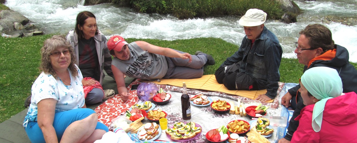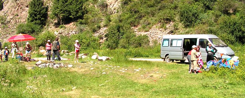 После купания - легкий ланч в расположенной на берегу реки беседке и подъем на микроавтобусе выше по ущелью еще на 2 - 3 км. Располагаемся в удобном и живописном месте. Группа с проводником отправляется на осмотр верховий ущелья, где находятся два небольших, но достойных внимания водопада, а на стоянке начинается интенсивная подготовка к пикнику с шашлыком, который будет готов к возвращению наших туристов. На обратном пути - обещанная остановка для того, чтобы сделать фотоснимки на фоне пещеры и устья ущелья.